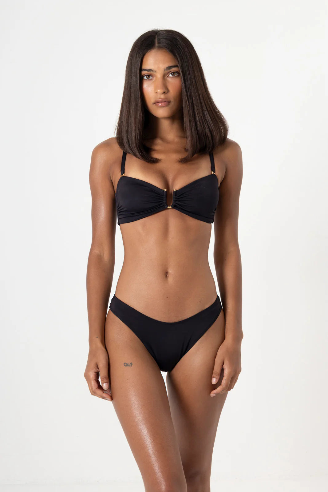 The Cuevas top by MUDI SWIM is a bandeau style with a hammered gold U-shaped centre detail. Designed to stay secure with non-slip silicone lining and side boning. Removable, adjustable straps allow versatile styling. Double lined for a smooth, comfortable feel.